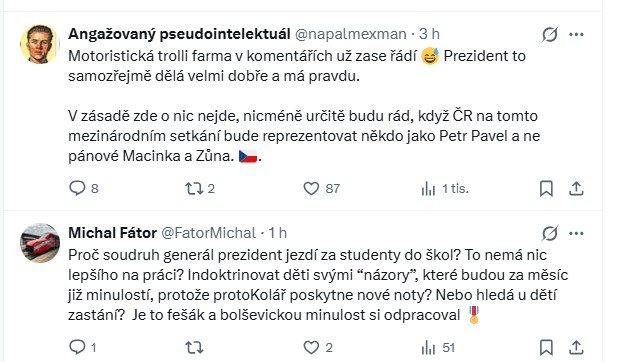 Vedle kritiky se objevily i komentáře, které prezidenta naopak hájí a považují jeho postup za správný. Diskutér upozornil na to, že Pavel podle něj jedná v souladu se svou rolí a měl by Česko reprezentovat i na mezinárodní úrovni. „Motoristická trollí farma v komentářích už zase řádí. Prezident to samozřejmě dělá velmi dobře a má pravdu. V zásadě zde o nic nejde, nicméně určitě budu rád, když ČR na tomto mezinárodním setkání bude reprezentovat někdo jako Petr Pavel a ne pánové Macinka a Zůna,“ uvedl.