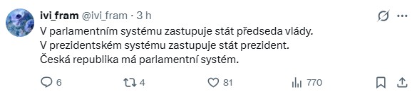 V diskusi zazněly i argumenty opírající se o ústavní uspořádání České republiky. „V parlamentním systému zastupuje stát předseda vlády a v prezidentském systému zastupuje stát prezident. Česká republika má parlamentní systém.“