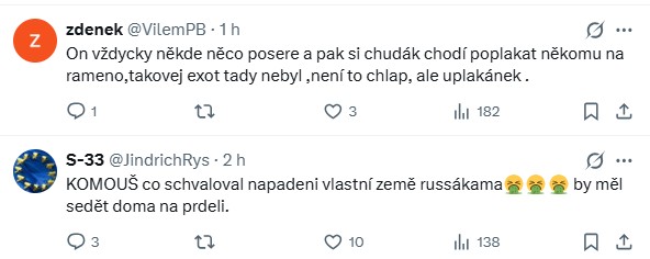 Jiný uživatel reagoval s tím, že ministr zahraničí Petra Pavla „parádně vykleštil“. Na to navázaly i další reakce, které opět sklouzly k osobním urážkám. „Co si to komunistické prase o sobě vlastně myslí.“
