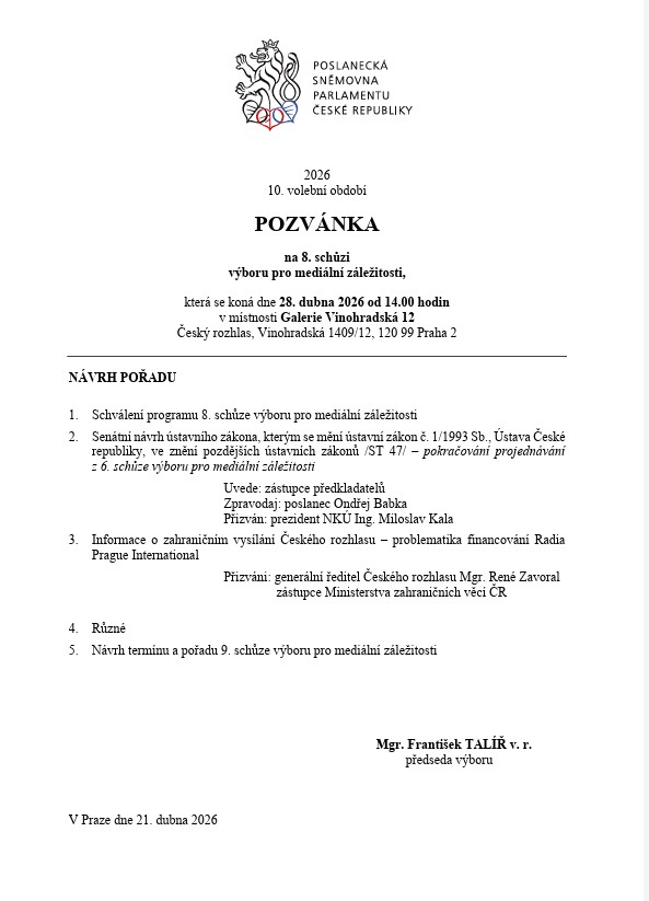 Výbor pro mediální záležitosti jednal v úterý 28. dubna od 14 hodin v prostorách Českého rozhlasu na pražských Vinohradech. Podle pozvánky na 8. schůzi měl být na programu mimo jiné senátní návrh ústavního zákona týkající se pravomoci Nejvyššího kontrolního úřadu, informace o zahraničním vysílání Českého rozhlasu, bod různé a návrh termínu další schůze.