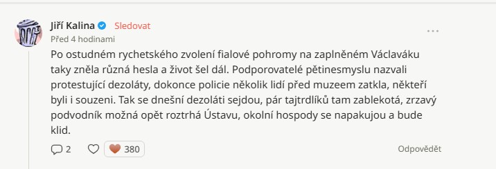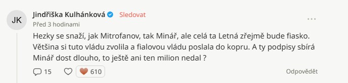 V komentářích se objevily i pochybnosti o tom, že by chystaná demonstrace měla výrazný dopad. Jedna z diskutujících uvedla: „Hezky se snaží jak Mitrofanov, tak Minář, ale celá ta Letná zřejmě bude fiasko. Většina si tuto vládu zvolila a fialovou vládu poslali do kopru.“