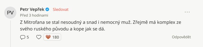 Nešlo přitom o první situaci, kdy svým komentářem vzbudil pozornost a vyvolal polemiku. Loni v listopadu se Alexandr Mitrofanov pustil do hodnocení projevu polského prezidenta Nawrockého, který vystoupil na Karlově univerzitě. Na síti X tehdy napsal, že prezident ve svém projevu „ani slovo o ruské invazi, zato tam tepal Evropskou unii“.