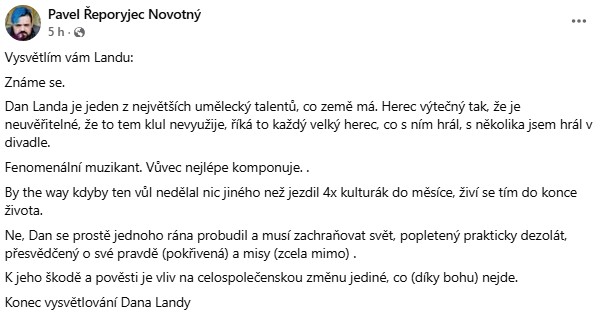 Pavel Novotný zpěváka nejprve výrazně pochválil pro jeho uměleckou tvorbu. „Dan Landa je jeden z největších uměleckých talentů, co země má. Herec výtečný tak, že je neuvěřitelné, že to ten kluk nevyužije,“ uvedl ve svém facebookovém příspěvku. A nešetřil uznáním ani směrem k jeho hudbě. „Fenomenální muzikant. Vůbec nejlépe komponuje,“ dodal.
