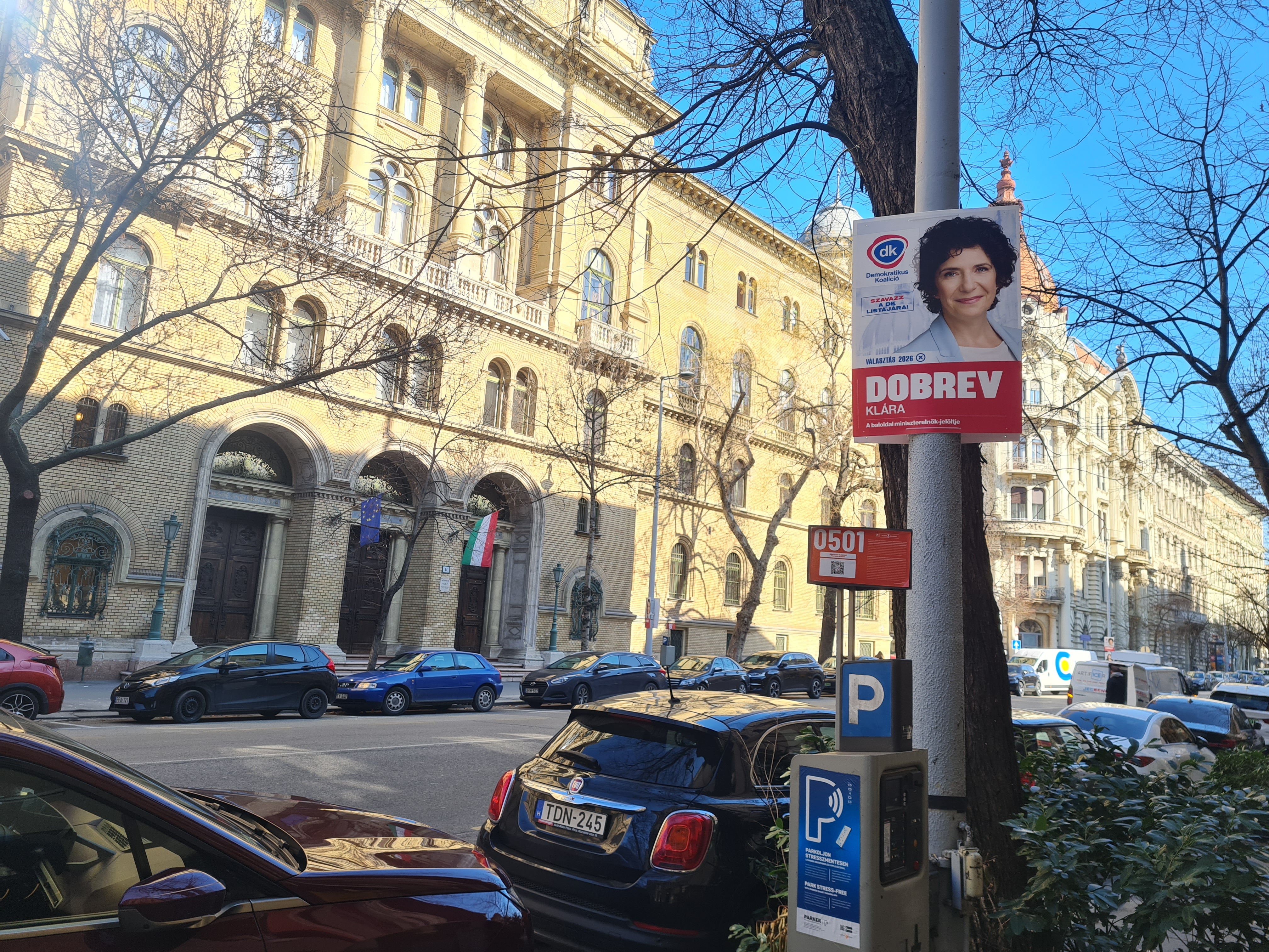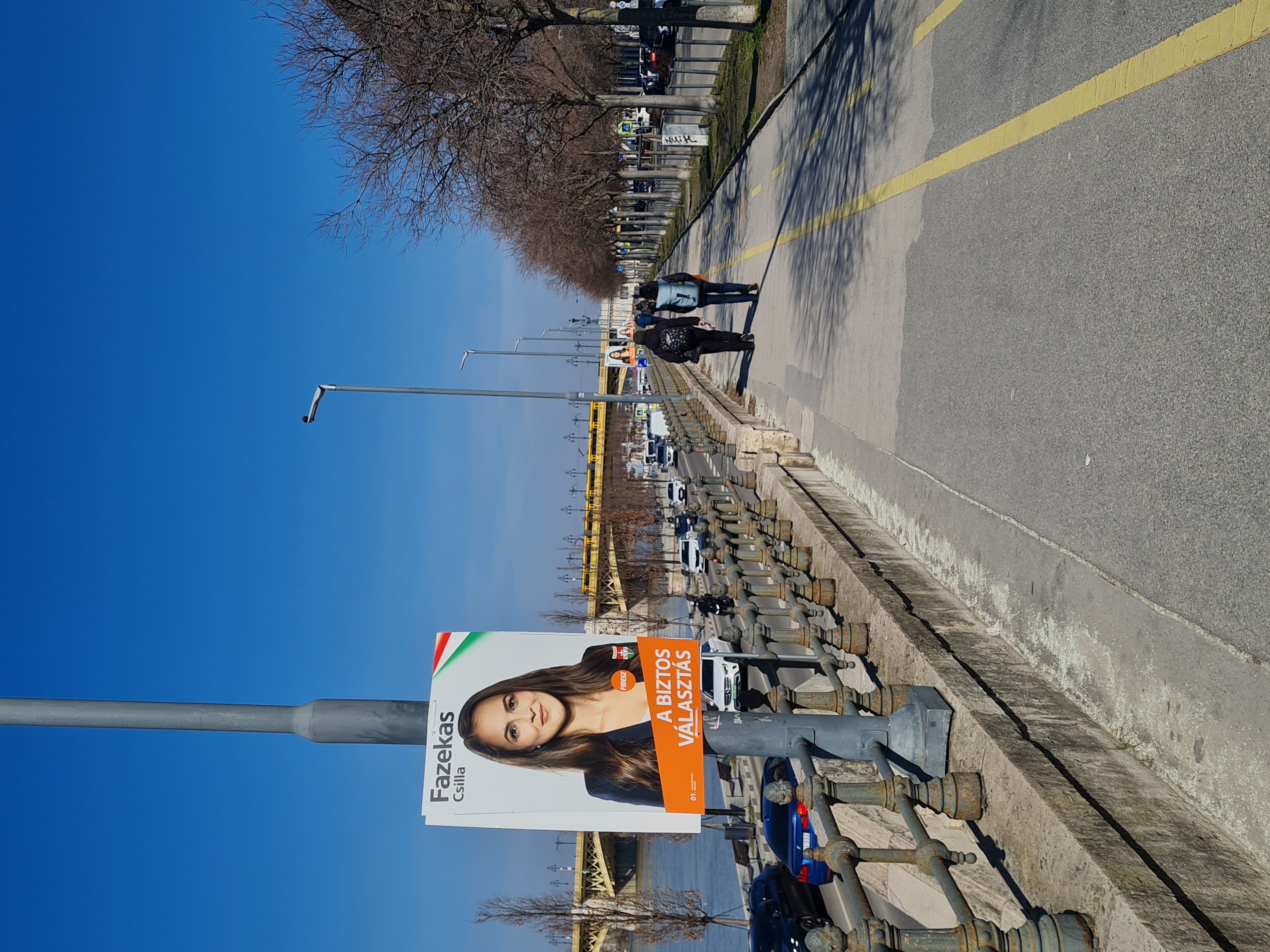 I v Budapešti, kde má Maďarská občanská unie pozici tradičně nejslabší, je její výlep zcela dominující. Plakáty vyvedené v tradiční oranžové (v Maďarsku se stále drží identifikace stran barvou) jsou doplněny maďarskou trikolorou, aby každý pochopil, která strana se posledních šestnáct let stará o národ.