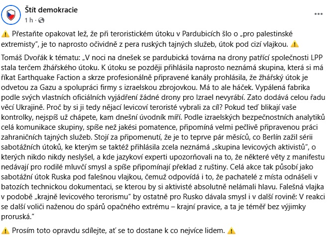 Přestaňte opakovat lež, že při teroristickém útoku v Pardubicích šlo o „pro palestinské extremisty“, je to naprosto očividně z pera ruských tajných služeb, útok pod cizí vlajkou,“ vzkazuje skupina, která před ruskými útoky varuje pravidelně. Jejich expertem na tuto oblast je Roman Máca, veterán Jandových Evropských hodnot.