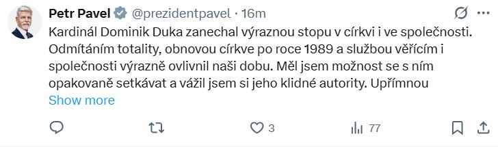 Ve 12.34 byl příspěvek ve znění: „Kardinál Dominik Duka zanechal výraznou stopu v církvi i ve společnosti. Odmítáním totality, obnovou církve po roce 1989 a službou věřícím i veřejnosti výrazně ovlivnil naši dobu. Měl jsem možnost se s ním opakovaně setkávat a vážil jsem si jeho klidné autority. Upřímnou soustrast rodině, blízkým i všem, pro které byl duchovní oporou,“ opět publikován.