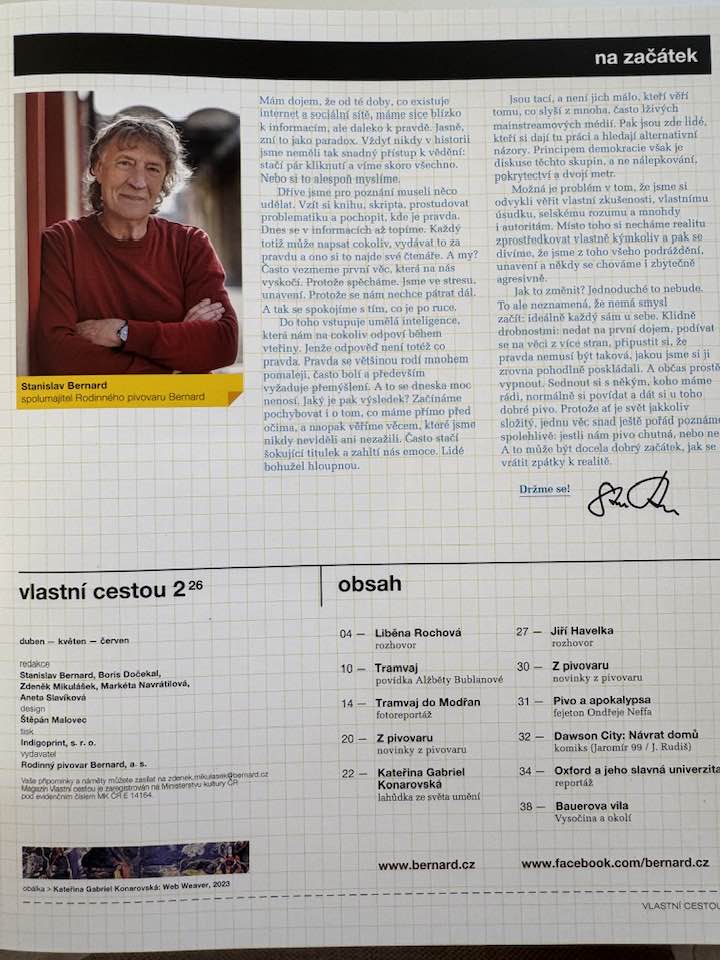 Zajímavou úvahu publikoval Stanislav Bernard, spolumajitel Rodinného pivovaru Bernard. „Mám dojem, že od té doby, co existuje internet a sociální sítě, máme sice blízko k informacím, ale daleko k pravdě. Jasně, zní to jako paradox. Vždyť nikdy v historii jsme neměli tak snadný přístup k vědění: stačí pár kliknutí a víme skoro všechno. Nebo si to alespoň myslíme,“ konstatuje v úvodníku magazínu Vlastní cestou.