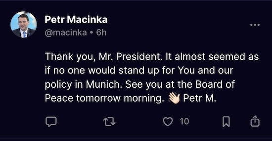 „Děkuji Vám, pane prezidente. Skoro to vypadalo, jako by se za Vás a naši politiku v Mnichově nikdo nepostavil. Uvidíme se zítra ráno na Radě míru. Petr M.,“ odpověděl na síti Truth Social ministr zahraničí americkému prezidentovi.