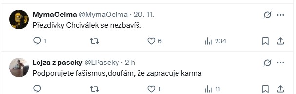 Další komentáře mířily na samotný princip pomoci Ukrajině a obviňovaly ji z ideologických motivů. Jeden uživatel uvedl: „Podporujete fašismus, doufám, že zapracuje karma.“ Pod příspěvkem se objevily i vzkazy Řehkovi, že se přezdívky „chciválek“ jen tak nezbaví.
