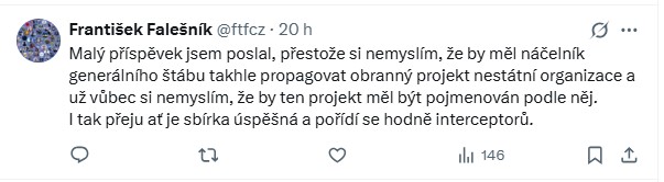 Objevily se však i kritické hlasy upozorňující na roli, kterou ve sbírce hraje šéf generálního štábu. Jeden z komentujících napsal: „Malý příspěvek jsem poslal, přestože si nemyslím, že by měl náčelník generálního štábu takhle propagovat obranný projekt nestátní organizace a už vůbec si nemyslím, že by ten projekt měl být pojmenován podle něj. I tak přeju, ať je sbírka úspěšná a pořídí se hodně interceptorů.“