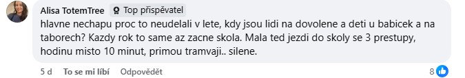 „Hlavně nechápu, proč to neudělali v létě, kdy jsou lidi na dovolené a děti u babiček a na táborech? Každý rok to samé až začne škola. Malá teď jezdí do školy se 3 přestupy, hodinu místo 10 minut, přímou tramvají. Šílené,“ napsala paní Alisa.