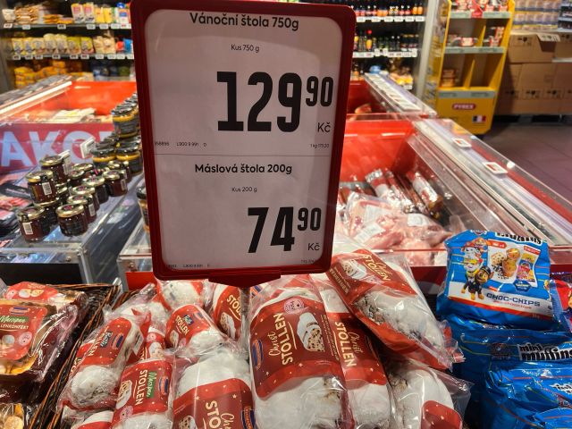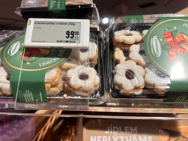 V minulých dnech jsme se zašli podívat i do obchodů, kde už se objevují jak krabičky s vánočním cukrovím, tak i další vánoční pečivo. Viděli jsme například vánoční kolekci cukroví – 700 gramů za 250 korun, skořicové hvězdy – 175 gramů za 70 korun, rohlíčky s vanilkovou příchutí – 250 gramů za 90 korun nebo linecké kytičky s máslem – 250 gramů za stovku. Viděli jsme i vánoční štolu – 750 gramů za 130 korun nebo máslovou štolu – 200 gramů za 75 korun.
