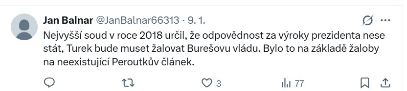 Podle něj by prezident musel nést osobní odpovědnost pouze v případě, že by Turkovi způsobil újmu mimo výkon své funkce. U oficiálního dopisu předsedovi vlády je to podle něj nepravděpodobné. „Není to výrok, který by použil jako osoba XY, tedy Petr Pavel,“ dodal. Uvažovat o žalobě přímo na prezidenta by bylo možné v případě výroků o Turkovi, které prezident veřejně pronesl ještě před vydáním oficiálního stanoviska.