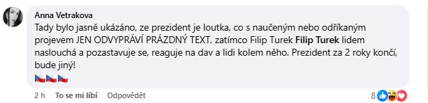 Jedna z uživatelek v diskusi napsala, že prezident podle ní působí jen jako „loutka s naučeným projevem“, zatímco Filip Turek podle ní naopak lidem naslouchá, reaguje na atmosféru v sále a dokáže komunikovat přímo s davem i jednotlivci kolem sebe. Zároveň vyjádřila naději, že prezident „za dva roky končí“ a že ho nahradí někdo jiný.
