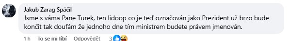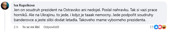 Video Filipa Turka dál rozproudilo debatu i mezi dalšími komentujícími, z nichž někteří přidali ještě ostřejší kritiku prezidenta. Jedna z diskutujících napsala: „Soudruh prezident na Ostravsko ani nedojel a poslal jen nahrávku, jak si váží práce horníků. Na Ukrajinu ale jede, i když je nemocný. Jede podpořit soudruhy banderovce a ještě slíbí dodat letadla. Takového máme výborného prezidenta,“ nešetřila kritikou.