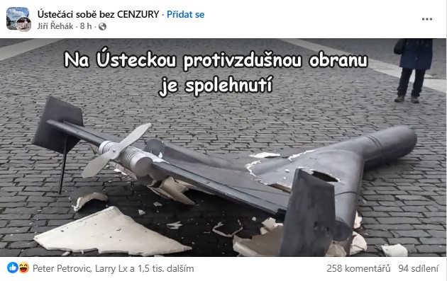 Na sociální síti Facebook se v sobotu objevily fotografie rozmlácených maket dronů Šáhid. Snímky zveřejnila profilová stránka Ústečáci sobě bez cenzury, která k nim připojila ironický komentář: „Na ústeckou protivzdušnou obranu je spolehnutí.“ O poškození makety dronu informoval také Ústecký deník.
