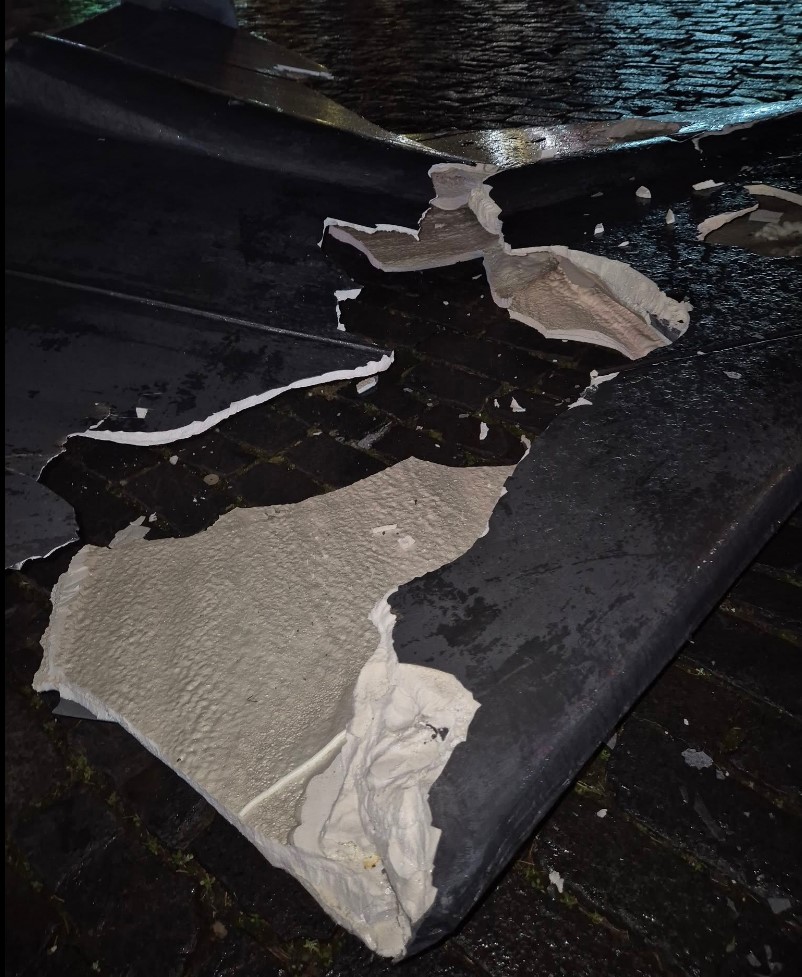Z fotografií zveřejněných v diskusi pod příspěvkem je patrné, že maketa byly výrazně poškozená a je přelomená vejpůl.