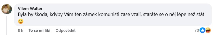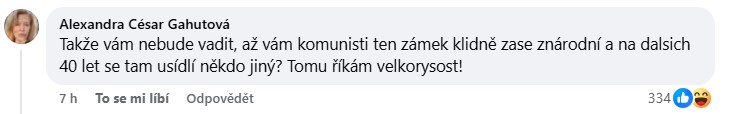 Další reagoval s ironií: „Takže vám nebude vadit, až vám komunisti ten zámek klidně zase znárodní a na dalších 40 let se tam usídlí někdo jiný? Tomu říkám velkorysost.“ Objevily se i dotazy, zda už je připraven na případné důsledky své volby: „Když jako majitel zámku volíte znárodňovače zámků, už máte sbaleno?“