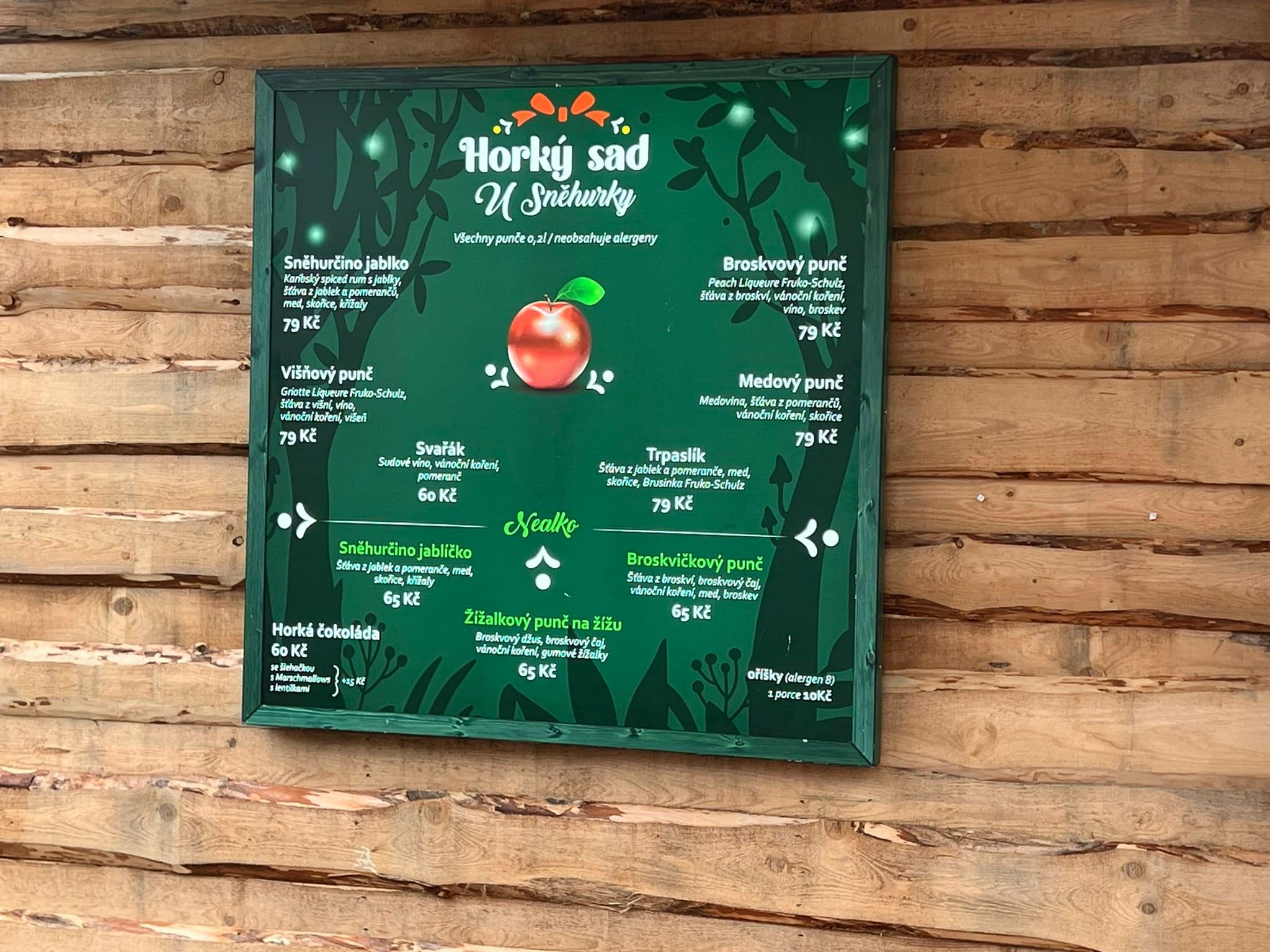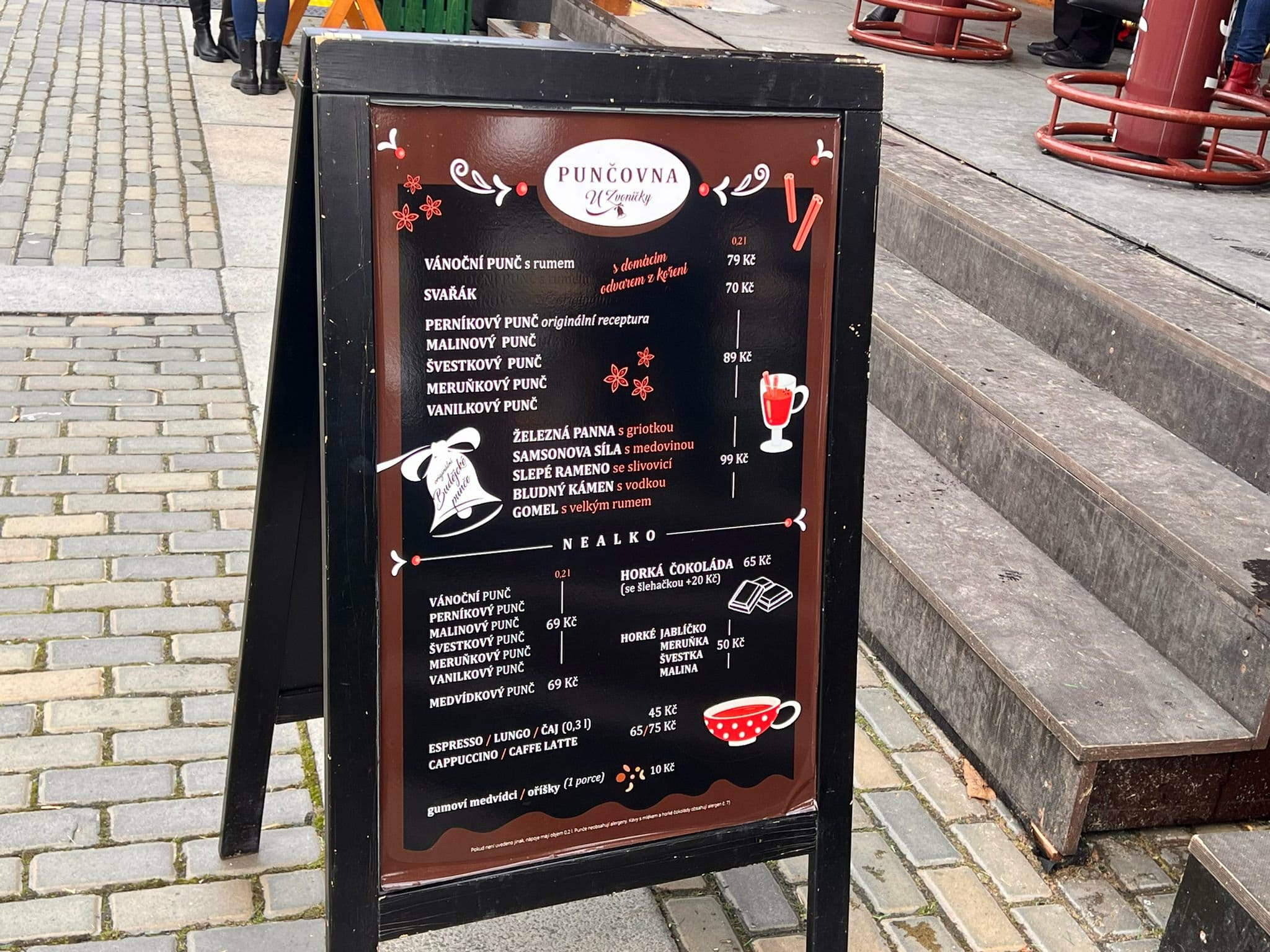 Objevili jsme například Vánoční punč s rumem za 79 korun, svařák za 70 korun nebo Staročeský punč s malinami za 79 korun. Železná panna s griotkou pak vyšla na 99 korun. Viděli jsme i bombardino, 0,1 za 90 korun, 0,2 za 180.