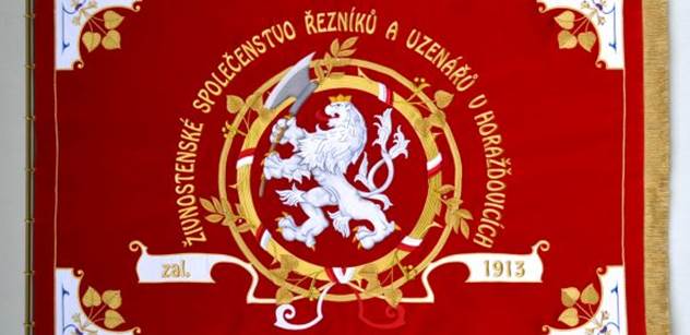 Takto například vypadal náš lev na vlajce řezníků a uzenářů v Horažďovicích, jejichž společenství si dokázalo zajišťovat identitu a působit čitelným moderním dojmem už někdy od druhé poloviny 16. století.