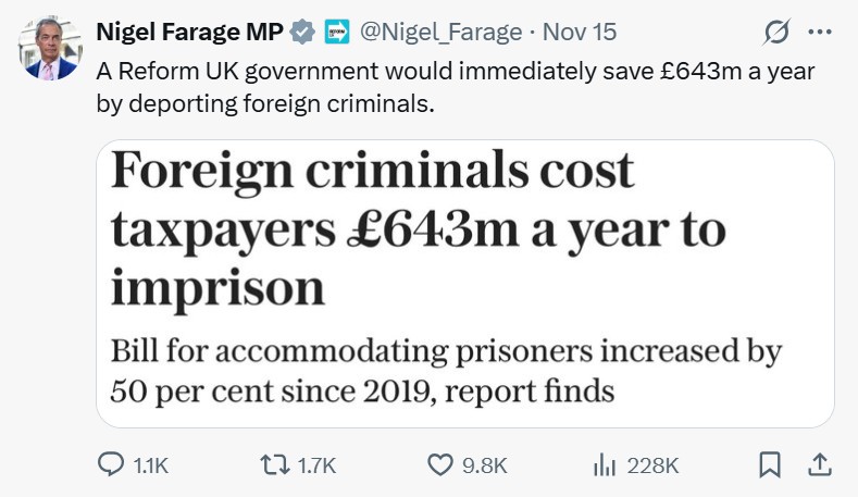 Nigel Farage na X přislíbil, že jeho Reform UK by „okamžitě ušetřila“ zmiňovaných 643 milionů liber ročně a zahraniční kriminálníky by deportovala.
