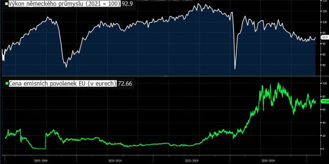 Kdo ovšem nyní velebí systém průmyslových emisních povolenek – těch prvního typu, těch pro velké podniky –, poněvadž přispěl ke snížení emisí v EU, vzývá i to, že příslušné firmy a provozy, případně výroba a s ní i zaměstnanost, odešly na jiné kontinenty, třeba do Asie, třeba Číny. Ano, probíhající deindustrializace EU je zaručeným způsobem, jak snižovat emise… To ostatně potvrzuje i vývoj v Německu, kde se výkon průmyslu trendově setrvale propadá už přelomu let 2017 a 2018, tedy od doby, kdy cena povolenek prvního typu začala výrazněji narůstat, jak zachycuje graf Bloombergu níže.
