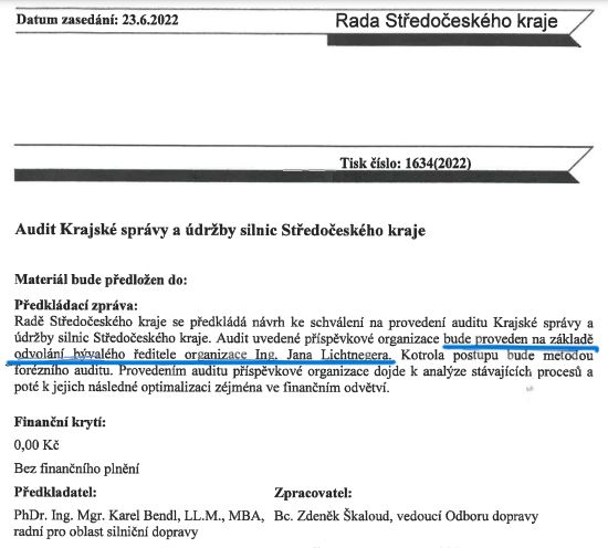 Poté, co byla v sídle krajských silničářů a v Lichtnegerově bydlišti provedena domovní prohlídka, odvolali středočeští radní ředitele z funkce a dokonce nařídili audit této největší krajské příspěvkové organizace „na základě odvolání ředitele Lichtnegera“, jak se psalo v materiálech z Rady kraje ze dne 23.6.2022.