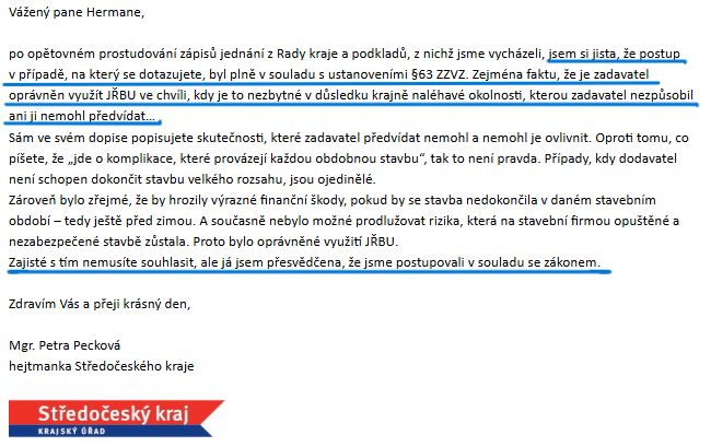 V souvislosti s tím je zajímavé, že přímo na tuto konkrétní zakázku byla upozorněna i samotná hejtmanka Pecková. Bylo jí řečeno, že zakázka nesplňovala podmínky pro vyhlášení bez výběrového řízení a ona odpověděla, že „je si jistá, že postup v případě, na který upozorňuji je plně v souladu se zákonem“.
