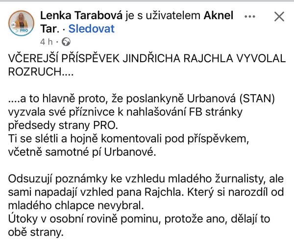 Předverejší příspěvek ať komentujete a nahlašujete Rajchla, který poštval svůj dav se slovy “nepostavil ani psí boudu” a “indoktrinovaný pseudointeligent” na novináře, který napsal článek, měl dohru až u paní Tarabové z PRO. Pod tímto příspěvkem jsem se jí vyjádřila, už to nemůžu najít, takže mě zablokovala zřejmě (což já dělám za sprostoty, sprostá jsem tam nebyla, jen jsem napsala, že lže, protože jsem nenapadla vzhled páně Rajchla, to já nedělám).