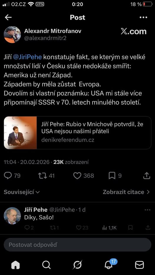 Jeho článek nesdílím, nicméně za přečtení stojí. Pochopíte pak, proč tato, v minulosti zamrzlá názorová škola “havlovské” politiky podlehla naprostému geopolitickému zmatení. “Západ” už je pro ně pouze a výhradně současná podoba EU, reprezentovaná eurokraty typu Ursula von der Leyen nebo zchromlými národními lídry jako Emmanuel Macron.