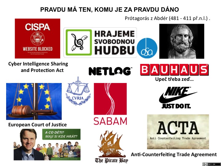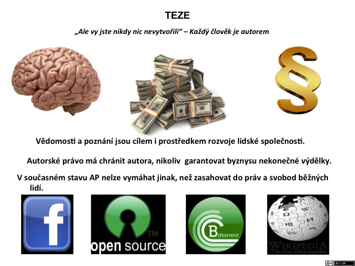 1) Vědomosti a poznání jsou cílem i prostředkem rozvoje lidské společnosti.2) Autorské právo má chránit autora, nikoliv garantovat byznysu nekonečné výdělky.3) V současném stavu nejde autorské právo vymáhat jinak, než zasahovat do práv a svobod běžných lidí.
