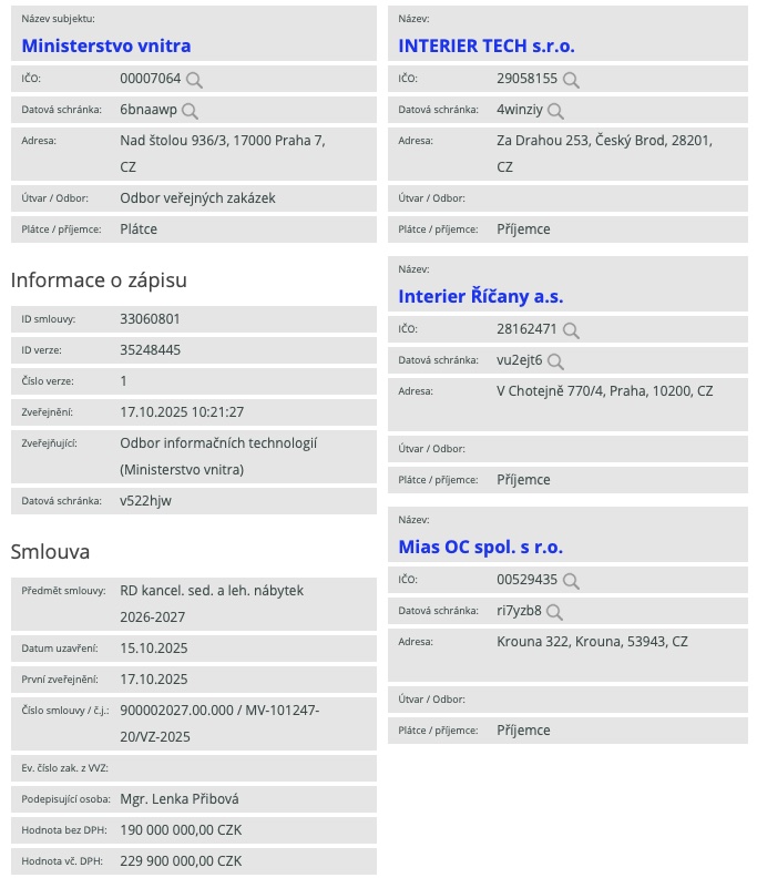 Nábytek a další kancelářské a jiné vybavení mají pro Ministerstvo vnitra dodávat tři společnosti. Konkrétně jde o INTERIER TECH s.r.o., Interier Říčany a.s. a Mias OC spol. s r.o. Tyto tři firmy si mezi sebe nábytkářskou zakázku snů rozdělí.