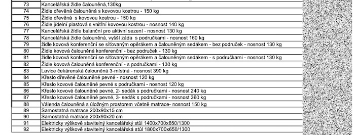 O jaký nábytek jde a proč je objem zakázky tak velký? Z páté části příloh smlouvy vyplývá, že jde o stovky kusů kancelářských stolů, židlí, skříněk, polic, křesílek, knihoven, šatních skříní, vybavení k postelím, pohovky, válendy, matrace apod. Součástí smlouvy je i ne zcela typické vybavení. Například dispečerské křeslo, které unese 200 kilogramů, a dokonce i křeslo s nosností 360 kg.