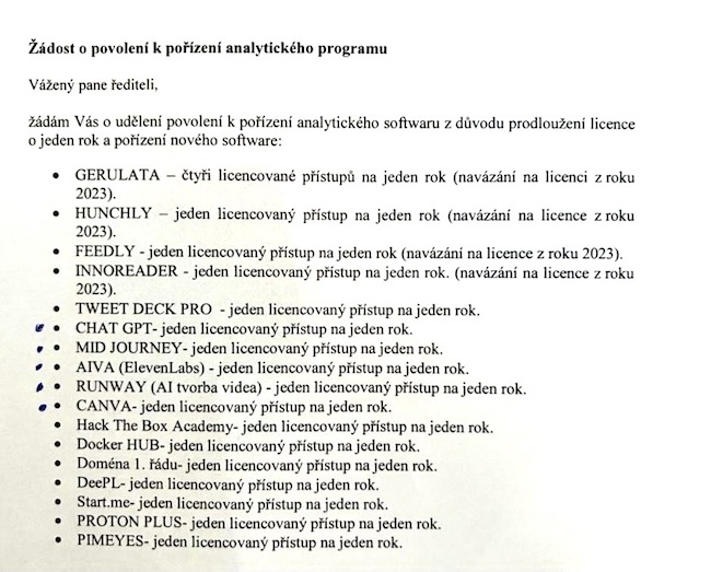 Naší redakci se podařilo získat nezačerněnou část dokumentu, který ukazuje, jaké typy softwaru si měli vojáci u svého velení objednávat:
